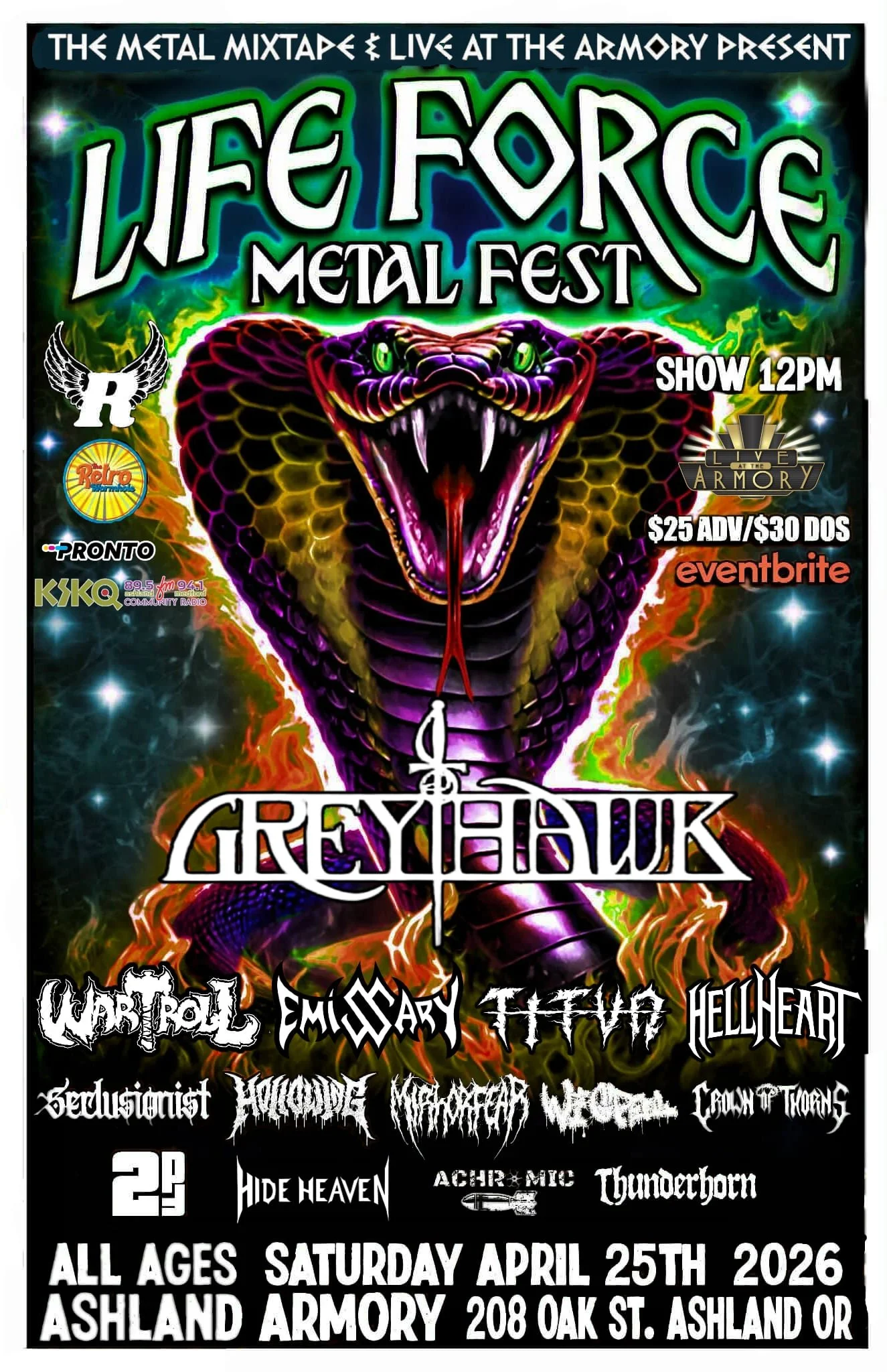 Featuring Headliner and International heavy metal touring Artist - Greyhawk from Seattle Washington! And 13 amazing local Heavy Metal artists bands from across the PNW!